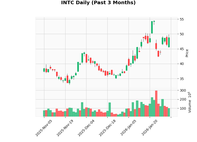 Intel Corporation (INTC) の最新の株式ニュースと見出しの分析から、競争上の地位と将来的な成長潜在性が再評価されていることがわかります。特に AI 分野における动向が注目を集めています。現在の株価は $48.81 で、過去 24 時間で 5.04% 上昇しており、これは強い買い気配を示しています。RSI (相対力指数) は 57.15 とやや上昇的指数ですが、過熱領域に達していません。チャート分析では、この上昇が短期的な調整後の再上昇局面にある可能性があります。